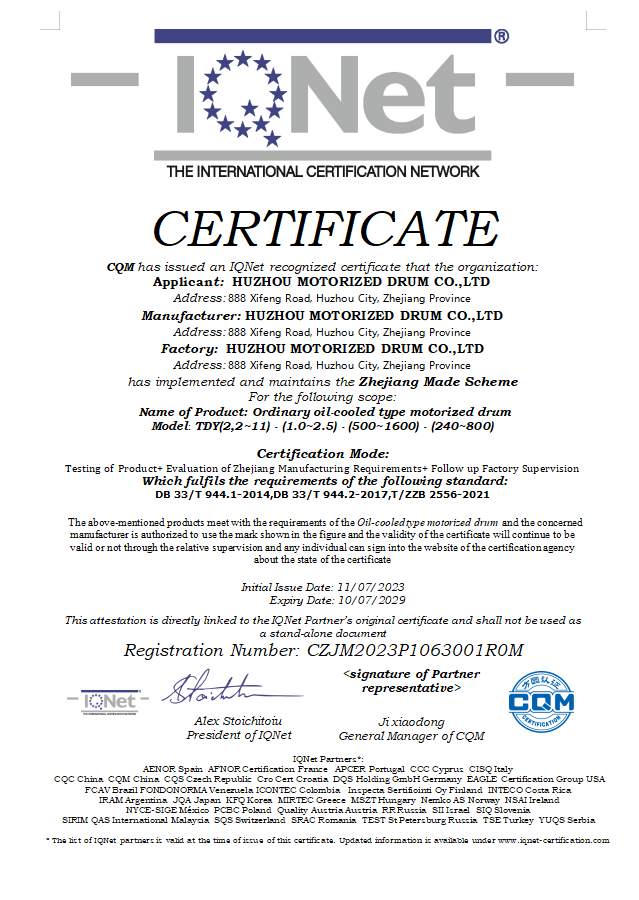As one of the drafting participants of the Chinese machinery industry standard - Motorised driving pulley part, Xingli Machine's Motorized pulley model TDY(2.2-11)-(1.0-2.5)-(500-1600)-(240-800) is certified by IQNET. The parameter